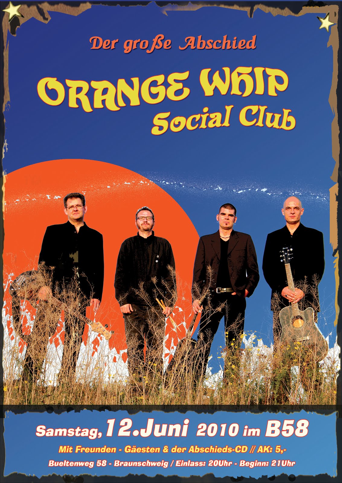 Der Orange Whip social club BS gibt seinen Abschied. Am 12. Juni 2010 geht eine lange Reise zu Ende. Die Braunschweiger Band Orange Whip spielt zum letzten mal für ihr treuen Fans und verlässt dann das Gebäude. Rückblickend auf eine Zeit voller Rock n Roll geben sich Jack, Bonny, Bogi und Phil ein Stelldichein mit Freunden und Wegbegleitern. Aus dem Repertoir der Bands Orange Whip und Don't Care! schöpfend, wollen die vier Herren mit ihren Gästen noch einmal richtig feiern. Ausserdem wird auch das ein oder andere musikalische Vorbild oder Idol neu interpretiert, was einen langen, stimmungsvollen Abend erwarten lässt. Rock On...